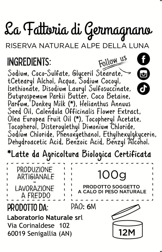 Sodium Coco-Sulfate, Glyceryl Stearate, Cetearyl Alcohol, Aqua, Sodium Cocoyl Isethionate, Disodium Lauryl Sulfosuccinate, Butyrospermum Parkii Butter, Coco-Betaine, Parfum, Donkey Milk (*), Helianthus Annuus Seed Oil, Calendula Officinalis Flower Extract, Olea Europaea Fruit Oil (*), Tocopheryl Acetate, Tocopherol, Distearoylethyl Dimonium Chloride, Sodium Chloride, Phenoxyethanol, Ethylhexylglycerin, Dehydroacetic Acid, Benzoic Acid, Benzyl Alcohol.